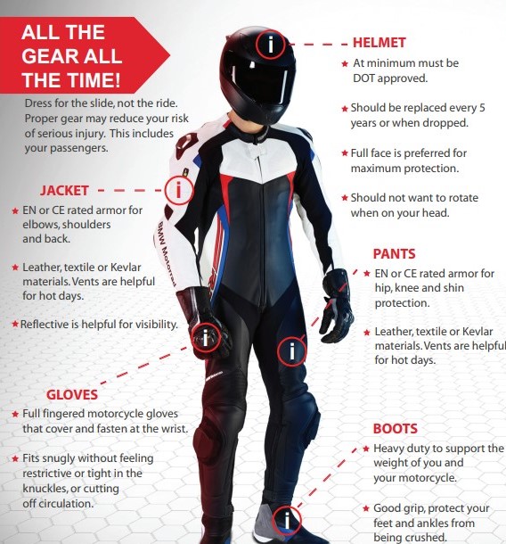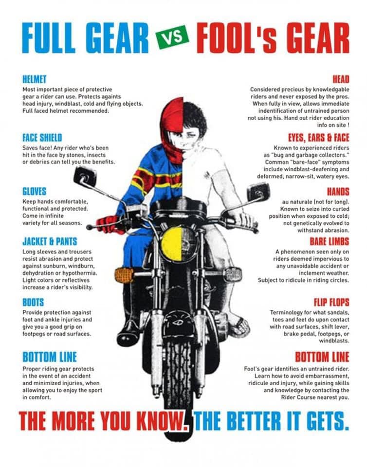 As we are more venerable due to being exposed whilst riding, other than being protected by a cage, as in a motor-vehicle, even the smallest spill can lead to serious injury. Proper riding gear may reduce your risk of serious injury. We dress for the slide and not for the ride, also, we would rather sweat than bleed. Lowveld Motorcycle Safety Initiative advocate and religiously preach the wearing of proper riding gear, does not matter what type or size motorcycle you ride.